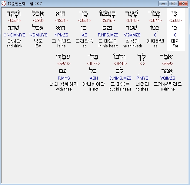 히브리어구약BHS,7 כִּי כְּמֹו־שָׁעַר בְּנַפְשֹׁו כֶּן־הוּא אֱכֹל וּשְׁתֵה יֹאמַר לָךְ וְלִבֹּו בַּל־עִמָּךְ׃
