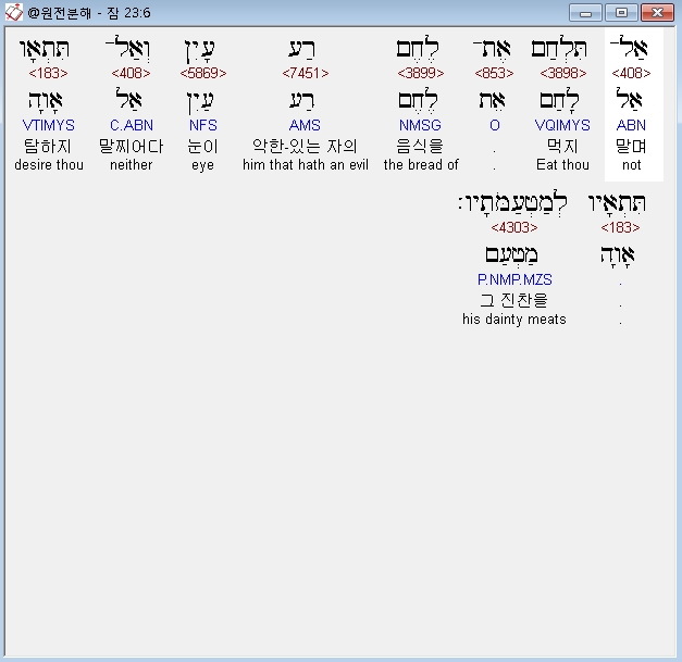 히브리어구약BHS,6 אַל־תִּלְחַם אֶת־לֶחֶם רַע עָיִן וְאַל־[כ= תִּתְאָו] [ק= תִּתְאָיו] לְמַטְעַמֹּתָיו׃