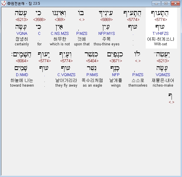 히브리어구약BHS,5 [כ= הֲתָעוּף] [ק= הֲתָעִיף] עֵינֶיךָ בֹּו וְאֵינֶנּוּ כִּי עָשֹׂה יַעֲשֶׂה־לֹּו כְנָפַיִם כְּנֶשֶׁר [כ= וְעָיֵף] [ק= יָעוּף] הַשָּׁמָיִם׃ ף