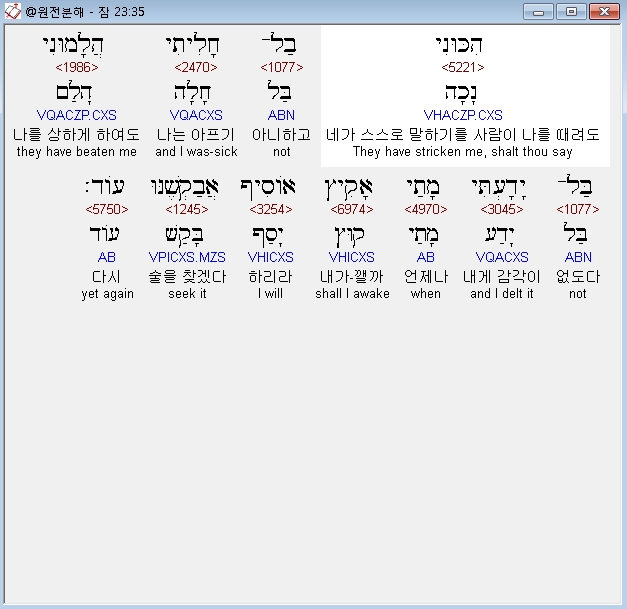 히브리어구약BHS,35 הִכּוּנִי בַל־חָלִיתִי הֲלָמוּנִי בַּל־יָדָעְתִּי מָתַי אָקִיץ אֹוסִיף אֲבַקְשֶׁנּוּ עֹוד׃