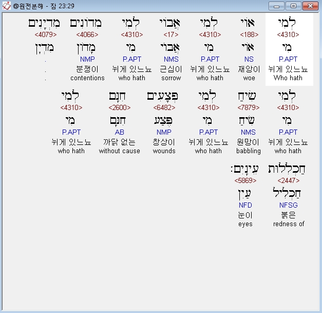 영어NASB,29 Who has woe? Who has sorrow? Who has contentions? Who has complaining? Who has wounds wiYout cause? Who has redness of eyes?