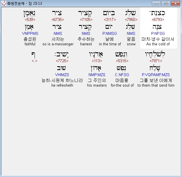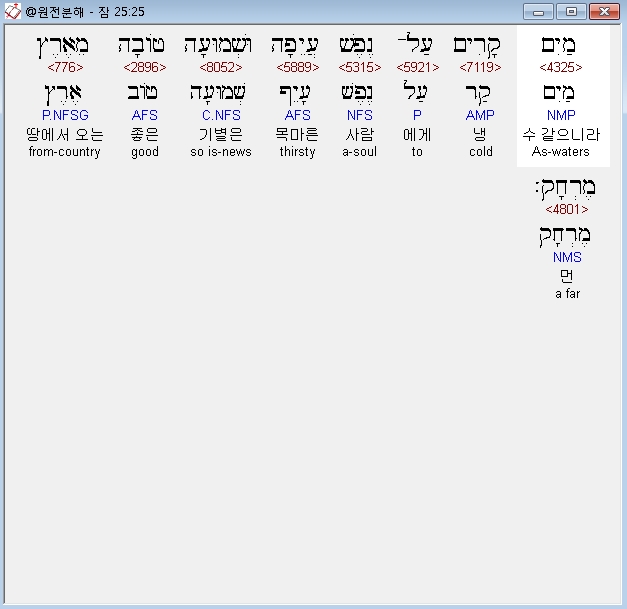 히브리어구약BHS,25 מַיִם קָרִים עַל־נֶפֶשׁ עֲיֵפָה וּשְׁמוּעָה טֹובָה מֵאֶרֶץ מֶרְחָק׃