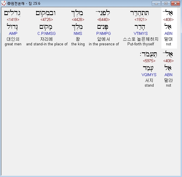 히브리어구약BHS,6 אַל־תִּתְהַדַּר לִפְנֵי־מֶלֶךְ וּבִמְקֹום גְּדֹלִים אַל־תַּעֲמֹד׃