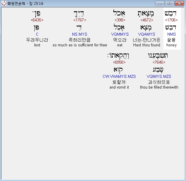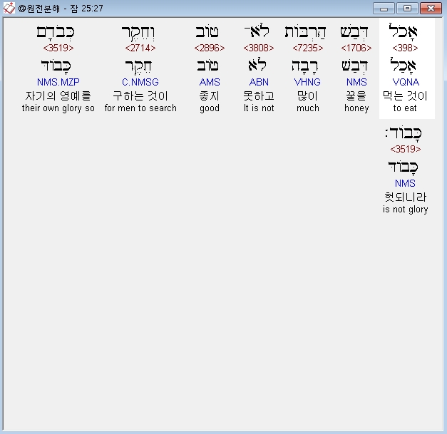 히브리어구약BHS,27 אָכֹל דְּבַשׁ הַרְבֹּות לֹא־טֹוב וְחֵקֶר כְּבֹדָם כָּבֹוד׃
