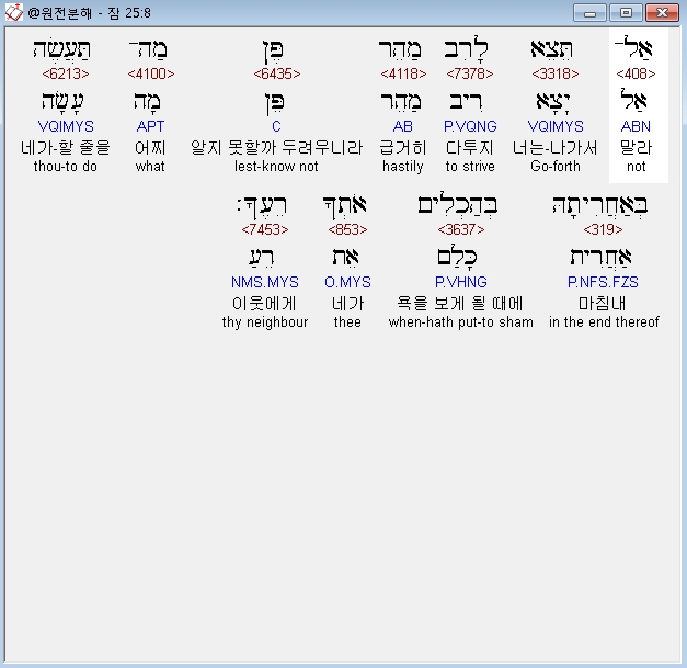 개역개정,8 너는 서둘러 나가서 다투지 말라 마침내 네가 이웃에게서 욕을 보게 될 때에 네가 어찌할 줄을 알지 못할까 두려우니라