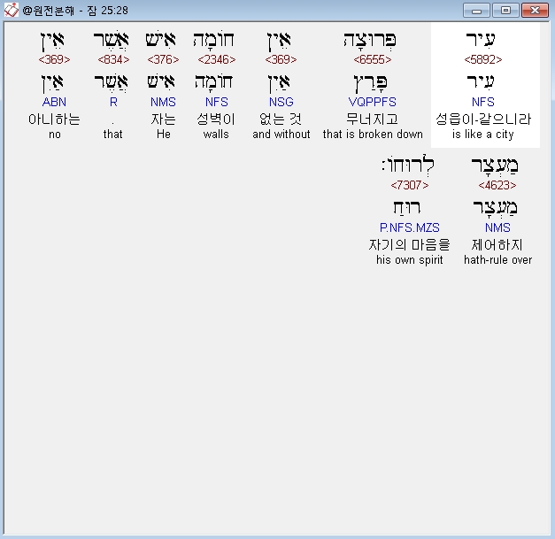 히브리어구약BHS,28 עִיר פְּרוּצָה אֵין חֹומָה אִישׁ אֲשֶׁר אֵין מַעְצָר לְרוּחֹו׃