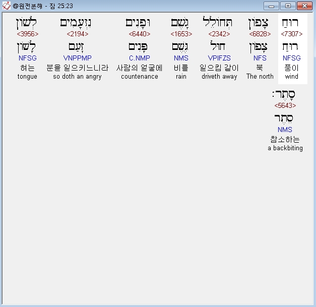 히브리어구약BHS,23 רוּחַ צָפֹון תְּחֹולֵל גָּשֶׁם וּפָנִים נִזְעָמִים לְשֹׁון סָתֶר׃