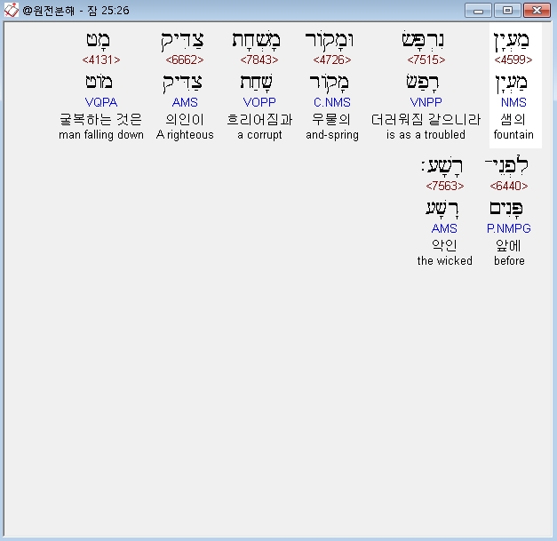 히브리어구약BHS,26 מַעְיָן נִרְפָּשׂ וּמָקֹור מָשְׁחָת צַדִּיק מָט לִפְנֵי־רָשָׁע׃