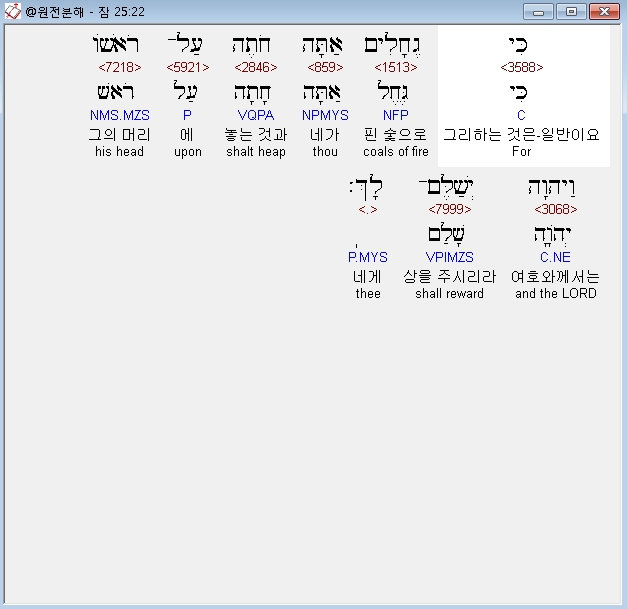 히브리어구약BHS,22 כִּי גֶחָלִים אַתָּה חֹתֶה עַל־רֹאשֹׁו וַיהוָה יְשַׁלֶּם־לָךְ׃