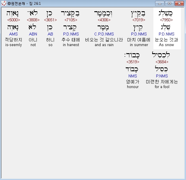 히브리어구약BHS,1 כַּשֶּׁלֶג בַּקַּיִץ וְכַמָּטָר בַּקָּצִיר כֵּן לֹא־נָאוֶה לִכְסִיל כָּבֹוד׃