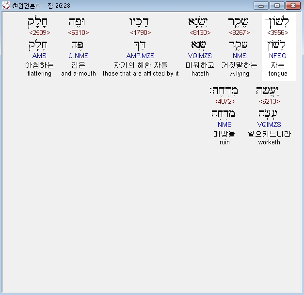 히브리어구약BHS,28 לְשֹׁון־שֶׁקֶר יִשְׂנָא דַכָּיו וּפֶה חָלָק יַעֲשֶׂה מִדְחֶה׃