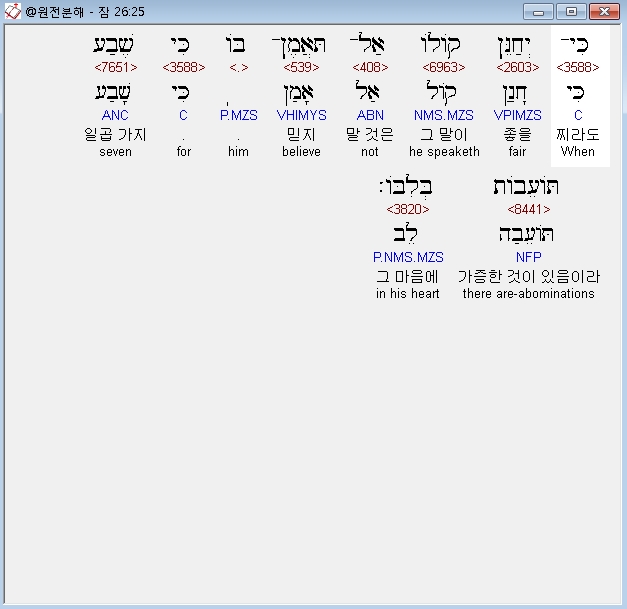 히브리어구약BHS,25 כִּי־יְחַןֵּן קֹולֹו* אַל־תַּאֲמֶן־בֹּו כִּי שֶׁבַע תֹּועֵבֹות בְּלִבֹּו׃