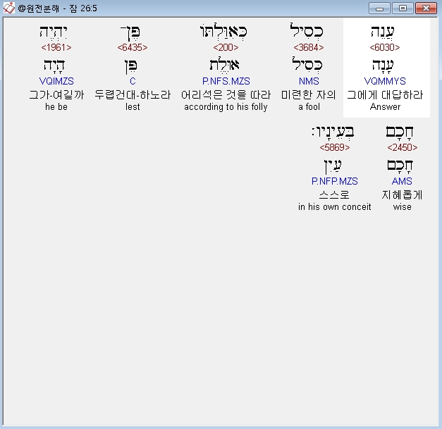 히브리어구약BHS,4 אַל־תַּעַן כְּסִיל כְּאִוַּלְתֹּו פֶּן־תִּשְׁוֶה־לֹּו גַם־אָתָּה׃