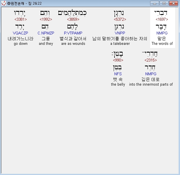 히브리어구약BHS,22 דִּבְרֵי נִרְגָּן כְּמִתְלַהֲמִים וְהֵם יָרְדוּ חַדְרֵי־בָטֶן׃