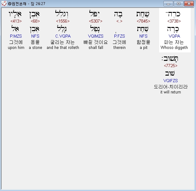 히브리어구약BHS,27 כֹּרֶה־שַּׁחַת בָּהּ יִפֹּל וְגֹלֵל אֶבֶן אֵלָיו תָּשׁוּב׃
