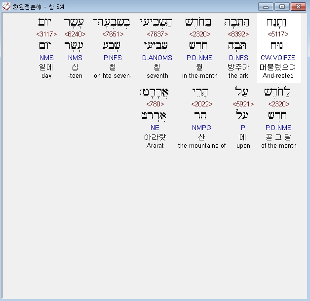 히브리어구약BHS,4 וַתָּנַח הַתֵּבָה בַּחֹדֶשׁ הַשְּׁבִיעִי בְּשִׁבְעָה־עָשָׂר יֹום לַחֹדֶשׁ עַל הָרֵי אֲרָרָט׃