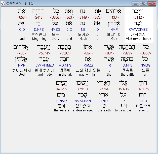 와이즈콜 엘로힘 엩 노아흐 웨에트 콜 하하야 웨엩 콜 하베헤마 아쉘 잍토 바테바 와야아베르 엘로힘 루아흐 알 하아레츠 와야숔쿠 함마임