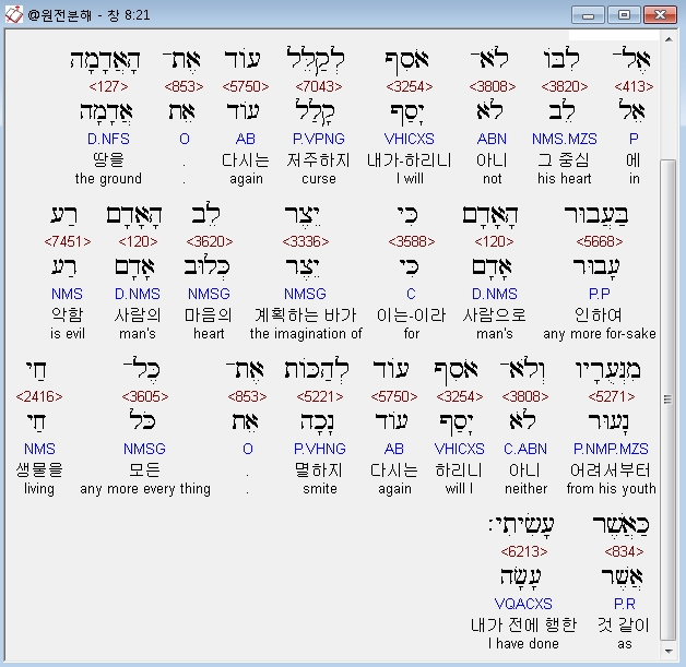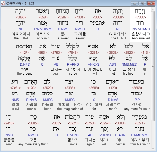히브리어구약BHS,21 וַיָּרַח יְהוָה אֶת־רֵיחַ הַנִּיחֹחַ וַיֹּאמֶר יְהוָה אֶל־לִבֹּו לֹא־אֹסִף לְקַלֵּל עֹוד אֶת־הָאֲדָמָה בַּעֲבוּר הָאָדָם כִּי יֵצֶר לֵב הָאָדָם רַע מִנְּעֻרָיו וְלֹא־אֹסִף עֹוד לְהַכֹּות אֶת־כָּל־חַי כַּאֲשֶׁר עָשִׂיתִי׃