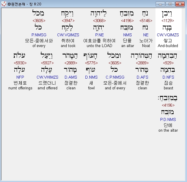 히브리어구약BHS,20 וַיִּבֶן נֹחַ מִזְבֵּחַ לַיהוָה וַיִּקַּח מִכֹּל הַבְּהֵמָה הַטְּהֹורָה וּמִכֹּל הָעֹוף הַטָּהֹר וַיַּעַל עֹלֹת בַּמִּזְבֵּחַ׃