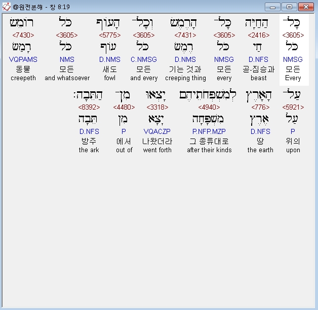 히브리어구약BHS,19 כָּל־הַחַיָּה כָּל־הָרֶמֶשׂ וְכָל־הָעֹוף כֹּל רֹומֵשׂ עַל־הָאָרֶץ לְמִשְׁפְּחֹתֵיהֶם יָצְאוּ מִן־הַתֵּבָה׃
