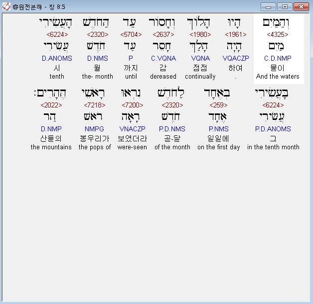 헬라어구약Septuagint,5 το δε υδωρ πορευομενον ηλαττονουτο εως του δεκατου μηνος εν δε τω ενδεκατω μηνι τη πρωτη του μηνος ωφθησαν αι κεφαλαι των ορεων