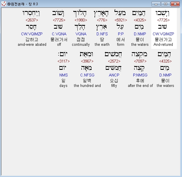 히브리어구약BHS,3 וַיָּשֻׁבוּ הַמַּיִם מֵעַל הָאָרֶץ הָלֹוךְ וָשֹׁוב וַיַּחְסְרוּ הַמַּיִם מִקְצֵה חֲמִשִּׁים וּמְאַת יֹום׃