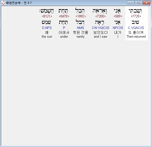 히브리어구약BHS,7 וְשַׁבְתִּי אֲנִי וָאֶרְאֶה הֶבֶל תַּחַת הַשָּׁמֶשׁ׃