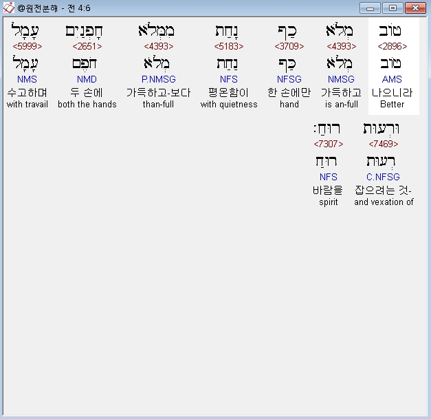 히브리어구약BHS,6 טֹוב מְלֹא כַף נָחַת מִמְּלֹא חָפְנַיִם עָמָל וּרְעוּת רוּחַ׃