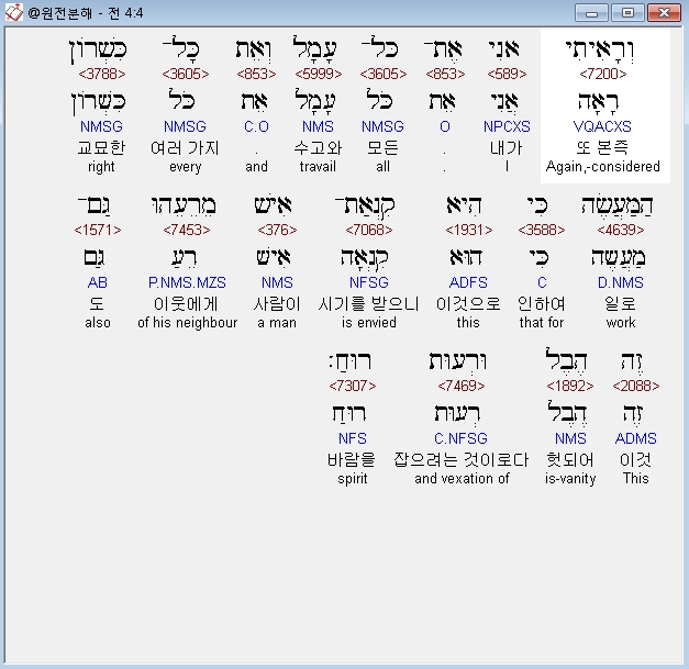 히브리어구약BHS,4 וְרָאִיתִי אֲנִי אֶת־כָּל־עָמָל וְאֵת כָּל־כִּשְׁרֹון הַמַּעֲשֶׂה כִּי הִיא קִנְאַת־אִישׁ מֵרֵעֵהוּ גַּם־זֶה הֶבֶל וּרְעוּת רוּחַ׃