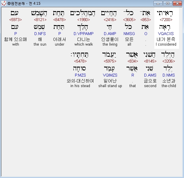 히브리어구약BHS,15 רָאִיתִי אֶת־כָּל־הַחַיִּים הַמְהַלְּכִים תַּחַת הַשָּׁמֶשׁ עִם הַיֶּלֶד הַשֵּׁנִי אֲשֶׁר יַעֲמֹד תַּחְתָּיו׃