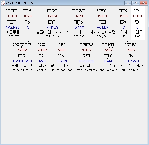 히브리어구약BHS,10 כִּי אִם־יִפֹּלוּ הָאֶחָד יָקִים אֶת־חֲבֵרֹו וְאִילֹו הָאֶחָד שֶׁיִּפֹּול וְאֵין שֵׁנִי לַהֲקִימֹו׃