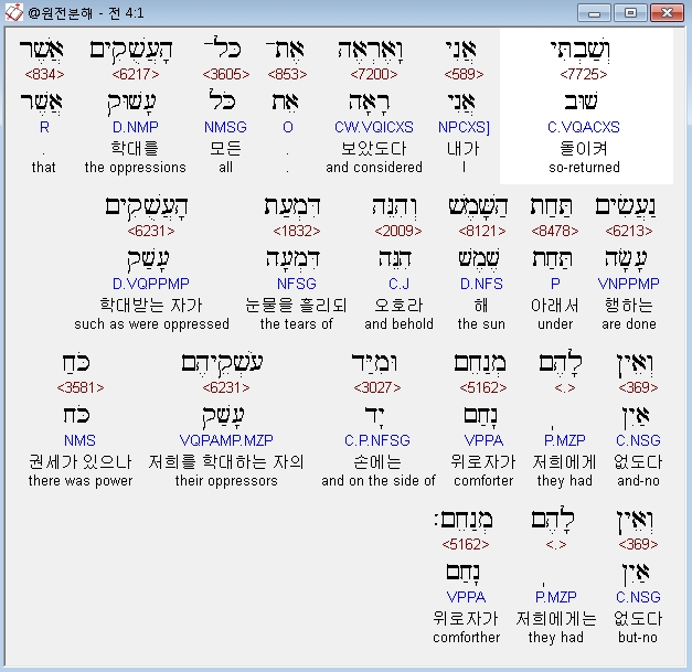 히브리어구약BHS,1 וְשַׁבְתִּי אֲנִי וָאֶרְאֶה אֶת־כָּל־הָעֲשֻׁקִים אֲשֶׁר נַעֲשִׂים תַּחַת הַשָּׁמֶשׁ וְהִנֵּה דִּמְעַת הָעֲשֻׁקִים וְאֵין לָהֶם מְנַחֵם וּמִיַּד עֹשְׁקֵיהֶם כֹּחַ וְאֵין לָהֶם מְנַחֵם׃