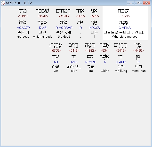 히브리어구약BHS,2 וְשַׁבֵּחַ אֲנִי אֶת־הַמֵּתִים שֶׁכְּבָר מֵתוּ מִן־הַחַיִּים אֲשֶׁר הֵמָּה חַיִּים עֲדֶנָה׃