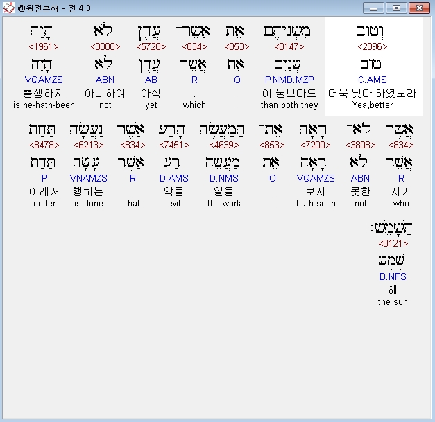 히브리어구약BHS,3 וְטֹוב מִשְּׁנֵיהֶם אֵת אֲשֶׁר־עֲדֶן לֹא הָיָה אֲשֶׁר לֹא־רָאָה אֶת־הַמַּעֲשֶׂה הָרָע אֲשֶׁר נַעֲשָׂה תַּחַת הַשָּׁמֶשׁ׃
