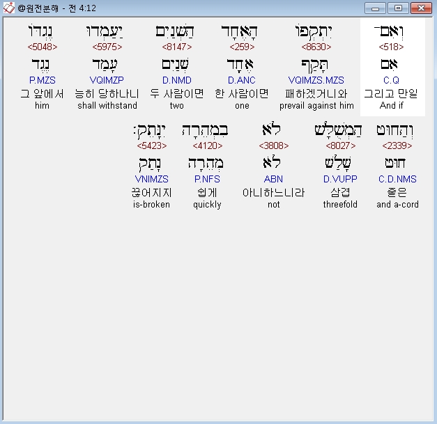 히브리어구약BHS,12 וְאִם־יִתְקְפֹו הָאֶחָד הַשְּׁנַיִם יַעַמְדוּ נֶגְדֹּו וְהַחוּט הַמְשֻׁלָּשׁ לֹא בִמְהֵרָה יִנָּתֵק׃