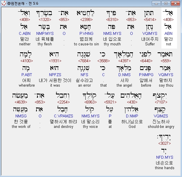 히브리어구약BHS,6 אַל־תִּתֵּן אֶת־פִּיךָ לַחֲטִיא אֶת־בְּשָׂרֶךָ וְאַל־תֹּאמַר לִפְנֵי הַמַּלְאָךְ כִּי שְׁגָגָה הִיא לָמָּה יִקְצֹף הָאֱלֹהִים עַל־קֹולֶךָ וְחִבֵּל אֶת־מַעֲשֵׂה יָדֶיךָ׃