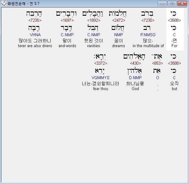 히브리어구약BHS,7 כִּי בְרֹב חֲלֹמֹות וַהֲבָלִים וּדְבָרִים הַרְבֵּה כִּי אֶת־הָאֱלֹהִים יְרָא׃