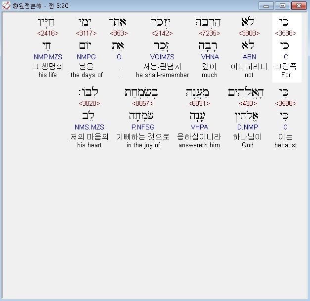 히브리어구약BHS,20 כִּי לֹא הַרְבֵּה יִזְכֹּר אֶת־יְמֵי חַיָּיו כִּי הָאֱלֹהִים מַעֲנֶה בְּשִׂמְחַת לִבֹּו׃