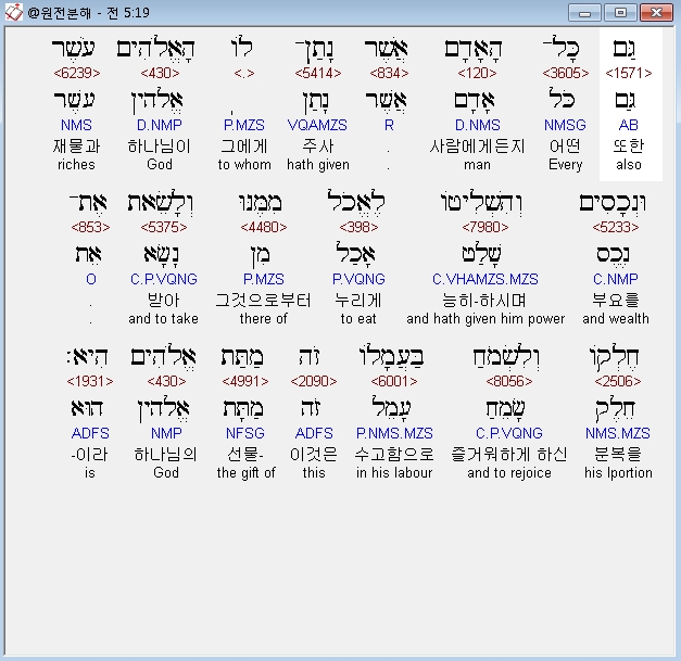 히브리어구약BHS,19 גַּם כָּל־הָאָדָם אֲשֶׁר נָתַן־לֹו הָאֱלֹהִים עֹשֶׁר וּנְכָסִים וְהִשְׁלִיטֹו לֶאֱכֹל מִמֶּנּוּ וְלָשֵׂאת אֶת־חֶלְקֹו וְלִשְׂמֹחַ בַּעֲמָלֹו זֹה מַתַּת אֱלֹהִים הִיא׃