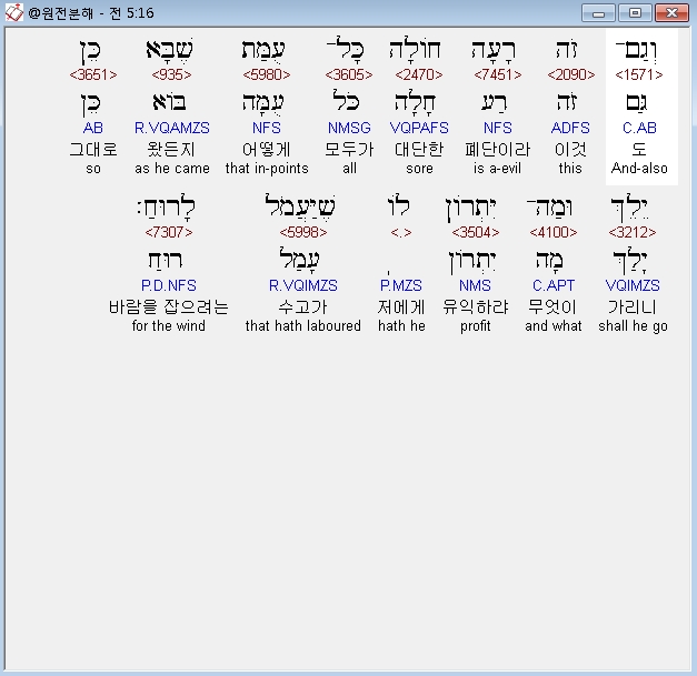 히브리어구약BHS,16 וְגַם־זֹה רָעָה חֹולָה כָּל־עֻמַּת שֶׁבָּא כֵּן יֵלֵךְ וּמַה־יִּתְרֹון לֹו שֶׁיַּעֲמֹל לָרוּחַ׃