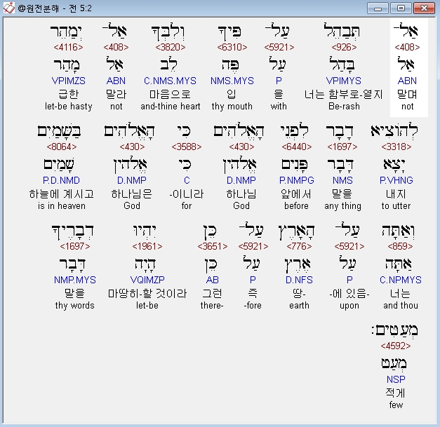 히브리어구약BHS,2 אַל־תְּבַהֵל עַל־פִּיךָ וְלִבְּךָ אַל־יְמַהֵר לְהֹוצִיא דָבָר לִפְנֵי הָאֱלֹהִים כִּי הָאֱלֹהִים בַּשָּׁמַיִם וְאַתָּה עַל־הָאָרֶץ עַל־כֵּנ* יִהְיוּ דְבָרֶיךָ מְעַטִּים׃