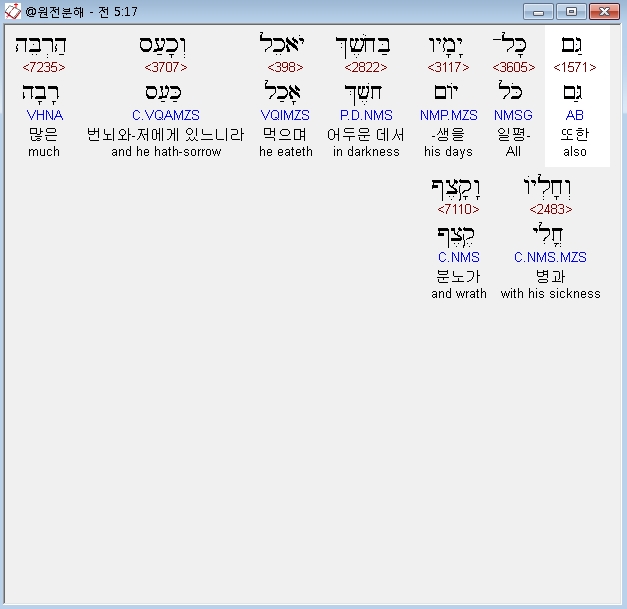 히브리어구약BHS,17 גַּם כָּל־יָמָיו בַּחֹשֶׁךְ יֹאכֵל וְכָעַס הַרְבֵּה וְחָלְיֹו וָקָצֶף׃