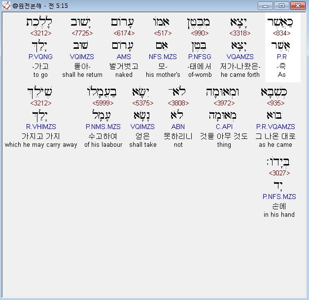 히브리어구약BHS,15 כַּאֲשֶׁר יָצָא מִבֶּטֶן אִמֹּו עָרֹום יָשׁוּב לָלֶכֶת כְּשֶׁבָּא וּמְאוּמָה לֹא־יִשָּׂא בַעֲמָלֹו שֶׁיֹּלֵךְ בְּיָדֹו׃