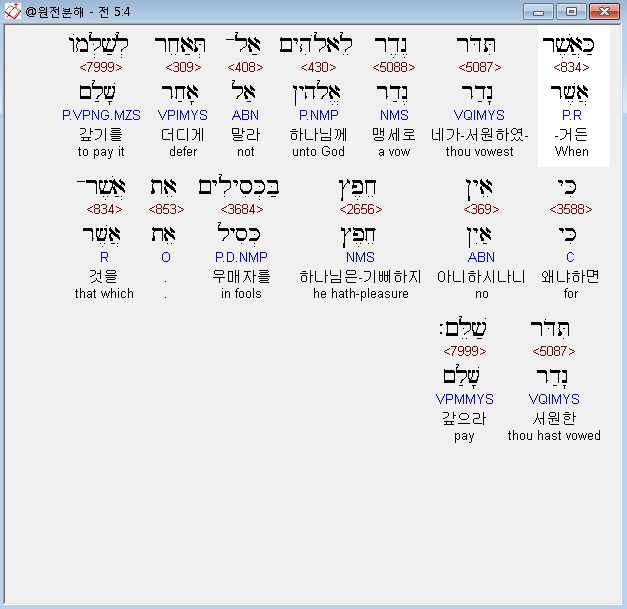 히브리어구약BHS,4 כַּאֲשֶׁר תִּדֹּר נֶדֶר לֵאלֹהִים אַל־תְּאַחֵר לְשַׁלְּמֹו כִּי אֵין חֵפֶץ בַּכְּסִילִים אֵת אֲשֶׁר־תִּדֹּר שַׁלֵּם׃