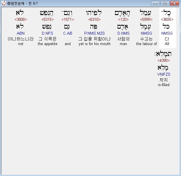 히브리어구약BHS,7 כָּל־עֲמַל הָאָדָם לְפִיהוּ וְגַם־הַנֶּפֶשׁ לֹא תִמָּלֵא׃