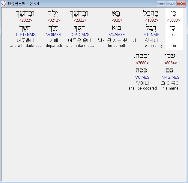 히브리어구약BHS,4 כִּי־בַהֶבֶל בָּא וּבַחֹשֶׁךְ יֵלֵךְ וּבַחֹשֶׁךְ שְׁמֹו יְכֻסֶּה׃