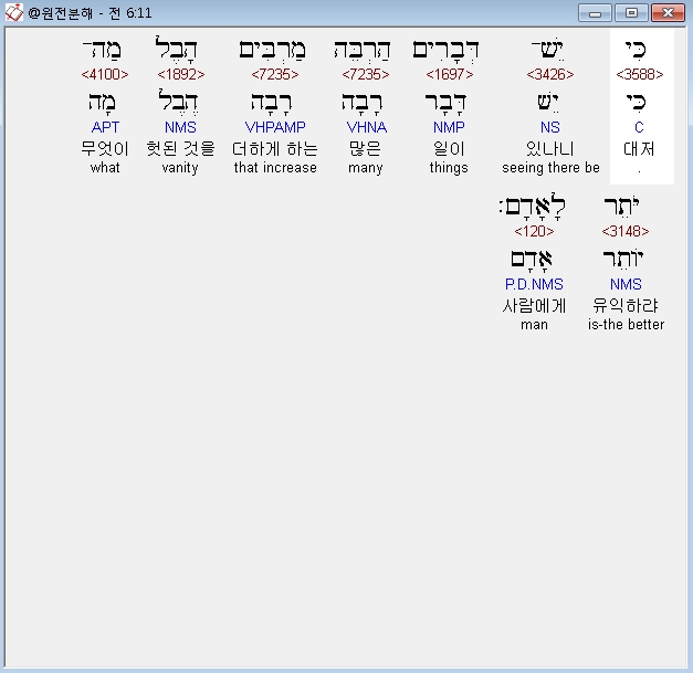 히브리어구약BHS,11 כִּי יֵשׁ־דְּבָרִים הַרְבֵּה מַרְבִּים הָבֶל מַה־יֹּתֵר לָאָדָם׃