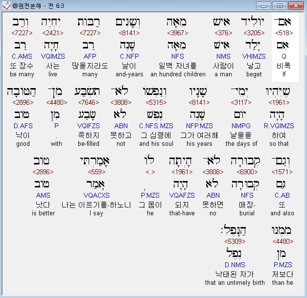 히브리어구약BHS,3 אִם־יֹולִיד אִישׁ מֵאָה וְשָׁנִים רַבֹּות יִחְיֶה וְרַב שֶׁיִּהְיוּ יְמֵי־שָׁנָיו וְנַפְשֹׁו לֹא־תִשְׂבַּע מִן־הַטֹּובָה וְגַם־קְבוּרָה לֹא־הָיְתָה לֹּו אָמַרְתִּי טֹוב מִמֶּנּוּ הַנָּפֶל׃