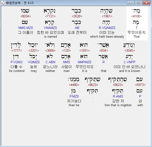히브리어구약BHS,10 מַה־שֶּׁהָיָה כְּבָר נִקְרָא שְׁמֹו וְנֹודָע אֲשֶׁר־הוּא אָדָם וְלֹא־יוּכַל לָדִין עִם [כ= שֶׁהַתַּקִּיף] [ק= שֶׁתַּקִּיף] מִמֶּנּוּ׃
