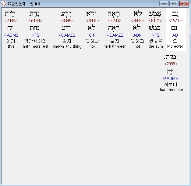 히브리어구약BHS,5 גַּם־שֶׁמֶשׁ לֹא־רָאָה וְלֹא יָדָע נַחַת לָזֶה מִזֶּה׃